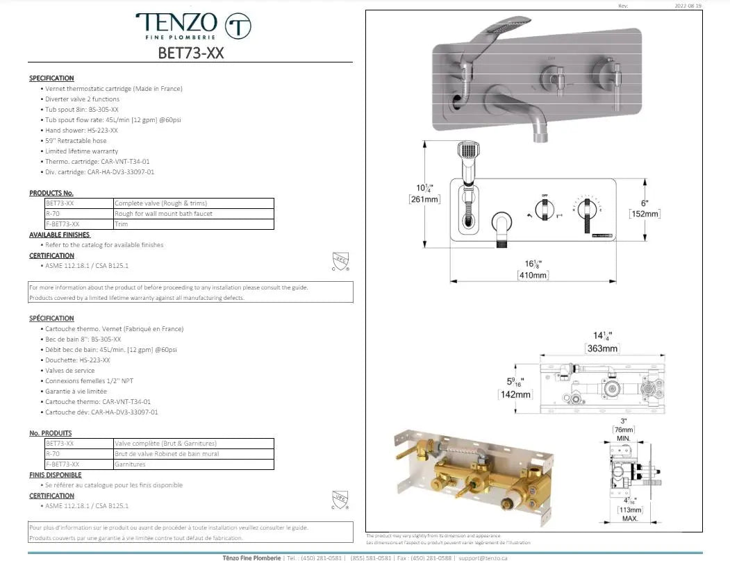 - Vernet thermostatic cartridge (Made in France)