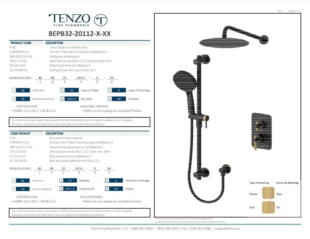 Tenzo BEPB32-20112-F Pressure Bal Shower Faucet 12 Inch Shower Head