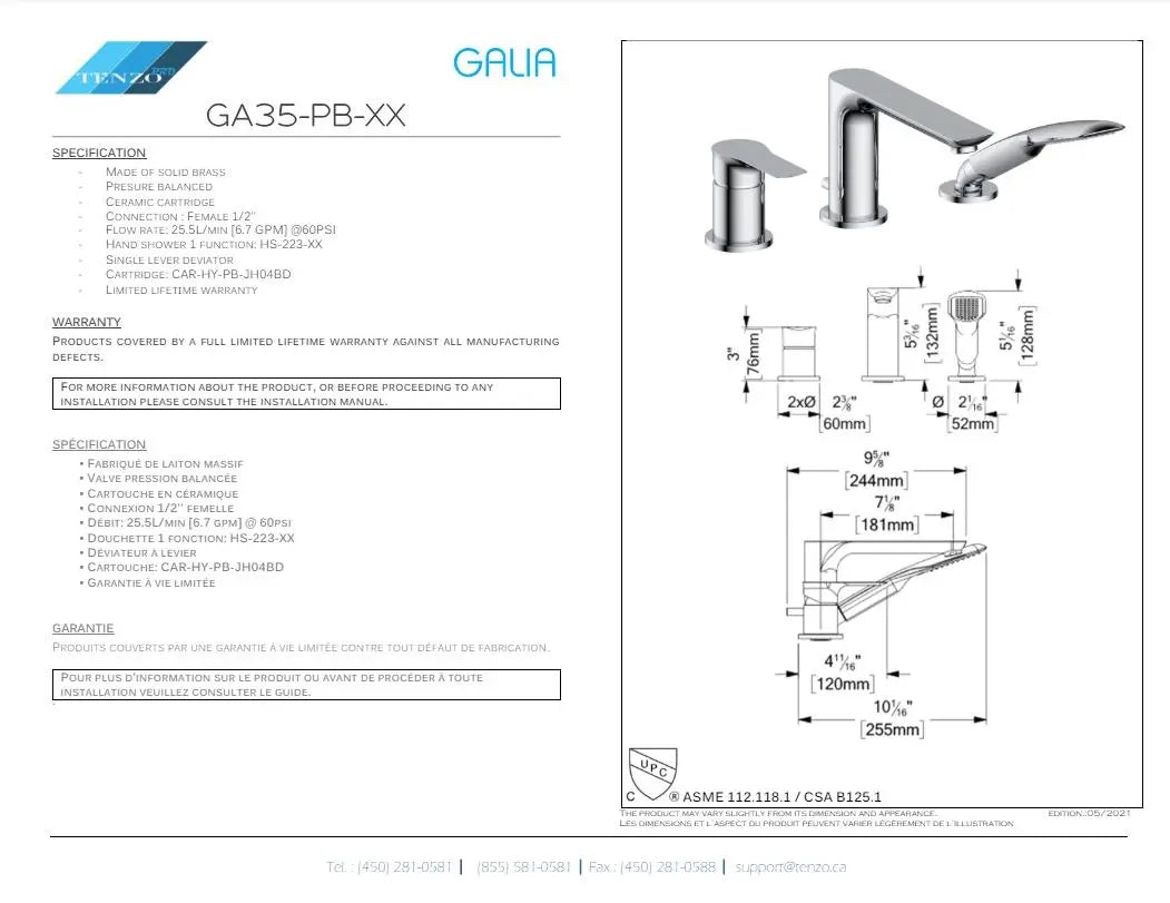 Made from solid brass | Pressure balanced valve | Ceramic cartridge | 1/2” female connection | Flow rate: 25.5L/min [6.7 gpm] @60psi | 1 Function hand shower:HS-223-XX | Lever diverter | Cartridge: CAR-HY-PB-JH04BD | Limited lifetime warranty | Made from solid brass | Pressure balanced valve | Ceramic cartridge | 1/2” female connection | Flow rate: 25.5L/min [6.7 gpm] @60psi | 1 Function hand shower:HS-223-XX | Lever diverter | Cartridge: CAR-HY-PB-JH04BD | Limited lifetime warranty | Technical sheet: DS_GA35-PB-XX.pdf | Installation manual: IM_GA35-PB-XX_web.pdf | Exploded view: GA35.pdf | Print