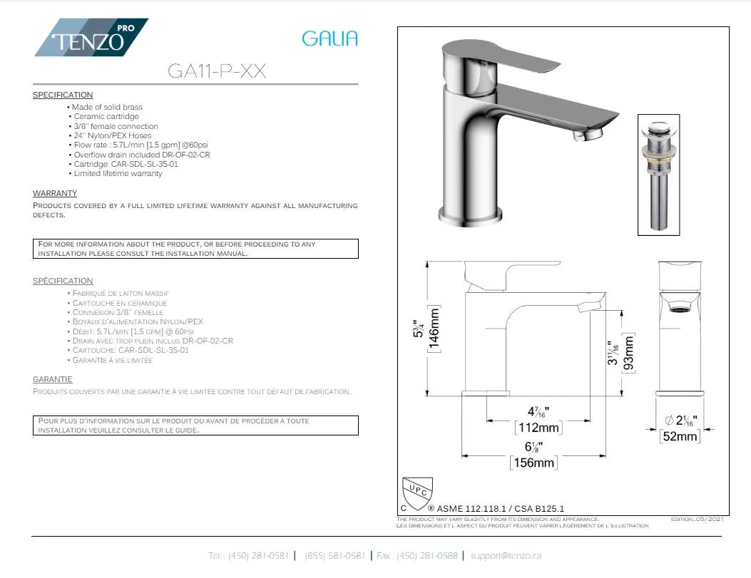 Made of solid brass | Ceramic cartridge | 3/8″‘ female connection | 24″ Nylon/PEX Hoses | Flow rate : 4.5L/min [1.2 gpm] @60psi | Overflow drain included DR-OF-02-XX | Cartridge: CAR-SDL-SL-35-01 | Limited lifetime warranty | Made of solid brass | Ceramic cartridge | 3/8″‘ female connection | 24″ Nylon/PEX Hoses | Flow rate : 4.5L/min [1.2 gpm] @60psi | Overflow drain included DR-OF-02-XX | Cartridge: CAR-SDL-SL-35-01 | Limited lifetime warranty | Technical sheet: DS_GA11-P-XX.pdf | Installation manual: IM_GA11_MY11_KA11_web.pdf | Print