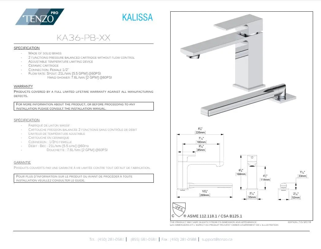 Made of solid brass | Balanced pressure valve | Ceramic cartridge | 1/2” female connection | Flow rate: 22L/min [4.8 gpm] @60psi | 1-Function hand shower: HS-225-XX | Cartridge : CAR-HY-PB-JH04BD | Limited lifetime warranty | Made of solid brass | Balanced pressure valve | Ceramic cartridge | 1/2” female connection | Flow rate: 22L/min [4.8 gpm] @60psi | 1-Function hand shower: HS-225-XX | Cartridge : CAR-HY-PB-JH04BD | Limited lifetime warranty | Technical sheet: DS_KA36-PB-XX.pdf | Installation manual: IM_KA36-XX.pdf | Print