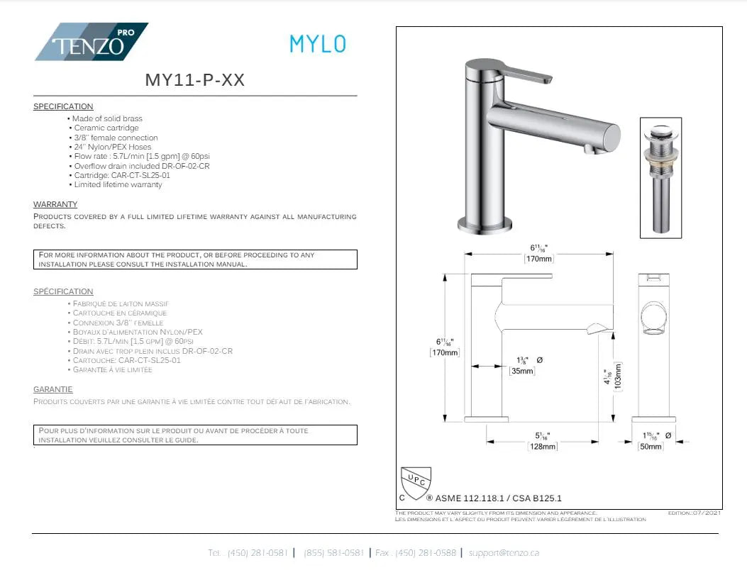 Made of solid brass | Ceramic cartridge | 3/8″ female connection | 24″ Nylon/PEX Hoses | Flow rate : 4.5L/min [1.2 gpm] @60psi | Overflow drain included DR-OF-02-XX | Cartridge: CAR-CT-SL25-01 | Limited lifetime warranty | Made of solid brass | Ceramic cartridge | 3/8″ female connection | 24″ Nylon/PEX Hoses | Flow rate : 4.5L/min [1.2 gpm] @60psi | Overflow drain included DR-OF-02-XX | Cartridge: CAR-CT-SL25-01 | Limited lifetime warranty | Technical sheet: DS_MY11-P-XX.pdf | Installation manual: IM_GA11_MY11_KA11_web.pdf | Print
