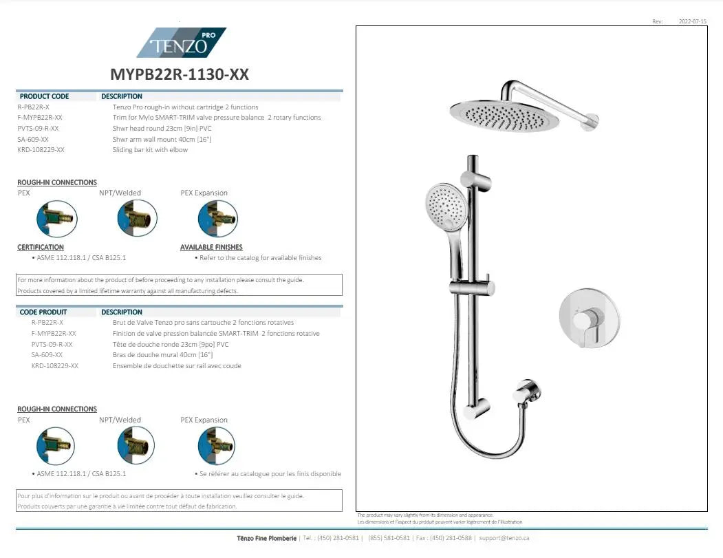 2 Functions rotary pressure balanced rough-in | 2 Functions SMART-TRIM (Not-Shared zone) | Round shower head 25cm [10”] | Shower arm 40cm [16”] | Sliding bar kit 3 functions | | 2 Functions rotary pressure balanced rough-in | 2 Functions SMART-TRIM (Not-Shared zone) | Round shower head 25cm [10”] | Shower arm 40cm [16”] | Sliding bar kit 3 functions | | Technical sheet: 44fhm_MYPB22R-1130-XX.pdf | Installation manual: d38nj_IM-MYPB22R-1130-XX.pdf | Print